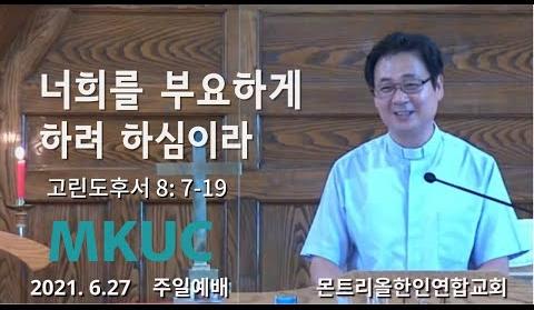 2021.06.27/주일예배/너희를 부요하게 하려 하심이라/고린도후서 8:7-19/몬트리올 한인연합교회/김진식 목사.