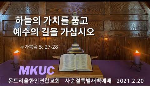 2021.2.20/사순절특새 04/하늘의 가치를 품고 예수의 길을 가십시오/누가복음 5: 27-28/몬트리올한인연합교회/김진식목사