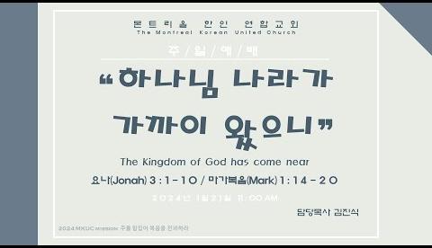 2024. 1. 21 / 주일예배 / 하나님 나라가 가까이 왔으니 / 요나(Jonah) 3: 1-10,마가복음(Mark) 1: 14-20/ 몬트리올한인연합교회 / 김진식목사