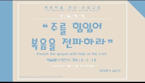 2024.01.07/ 주일예배/ 주를 힘입어 복음을 전파하라/ 데살로나가전서(1Th) 2:1-12/ 몬트리올한인연합교회/김진식목사