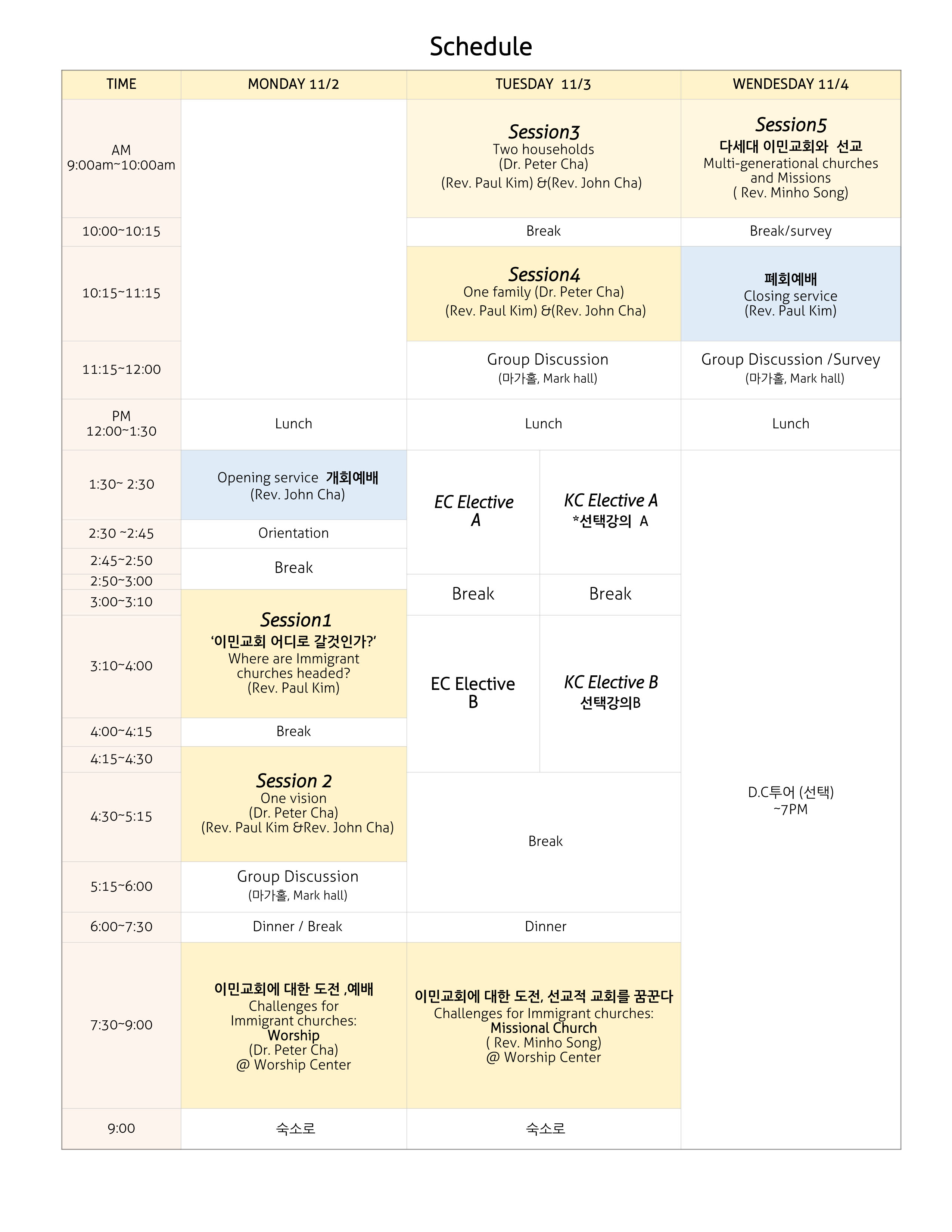 11월2일부터 4일까지 한어권과 영어권 사역자들 그리고 교회의 평신도 리더들이 함께 모여 교제를 나누고 이민교회의 미래를 꿈꾸는 귀한 시간이 되시길 기대합니다.