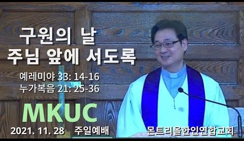 2021.11.28/주일예배/구원의 날, 주님 앞에 서도록/예레미야 33: 14-16, 누가복음 21:25-36/몬트리올 한인연합교회/김진식목사.