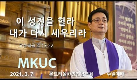 2021.03.07 주일예배/이 성전을 헐라 내가 다시 세우리라/요한복음 2: 13-22/몬트리올 한인연합교회/김진식 목사