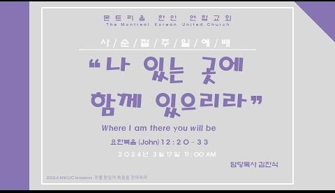 2024.3.17 주일예배/ 나 있는 곳에 함께 있으리라/ 요한복음(John) 12: 20-33/ 몬트리올한인연합교회/ 김진식목사