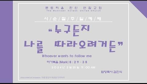 2024. 2. 25 주일예배/ 누구든지 나를 따라오려거든/ 마가복음8: 29-38/ 몬트리올한인연합교회/ 김진식목사.