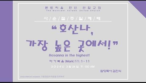 2024.3.24 주일예배/ 호산나, 가장 높은 곳에서! /마가복음(Mark) 11: 1-11 / 몬트리올한인연합교회/ 김진식목사