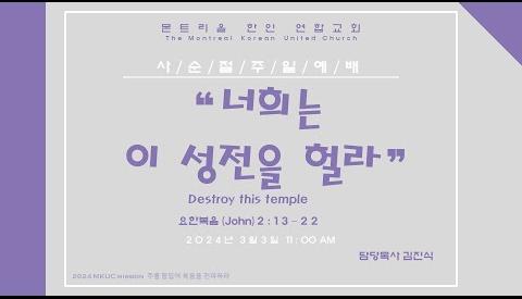 2024. 03.03 주일예배/너희는 이 성전을 헐라/요한복음(John) 2: 13-22/ 몬트리올한인연합교회/ 김진식목사