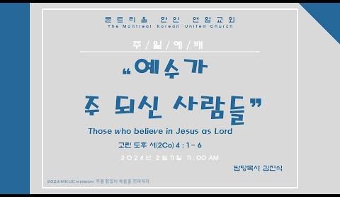 2024. 2. 11 주일예배/ 예수가 주 되신 사람들/ 고린도후서(2Co) 4: 1-6/ 몬트리올 한인연합교회/ 김진식목사