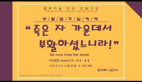 2024.3.31 부활절 주일예배/ 죽은 자 가운데서 부활하셨느니라/사도행전(Acts) 10: 34-44 / 몬트리올한인연합교회/ 김진식목사.