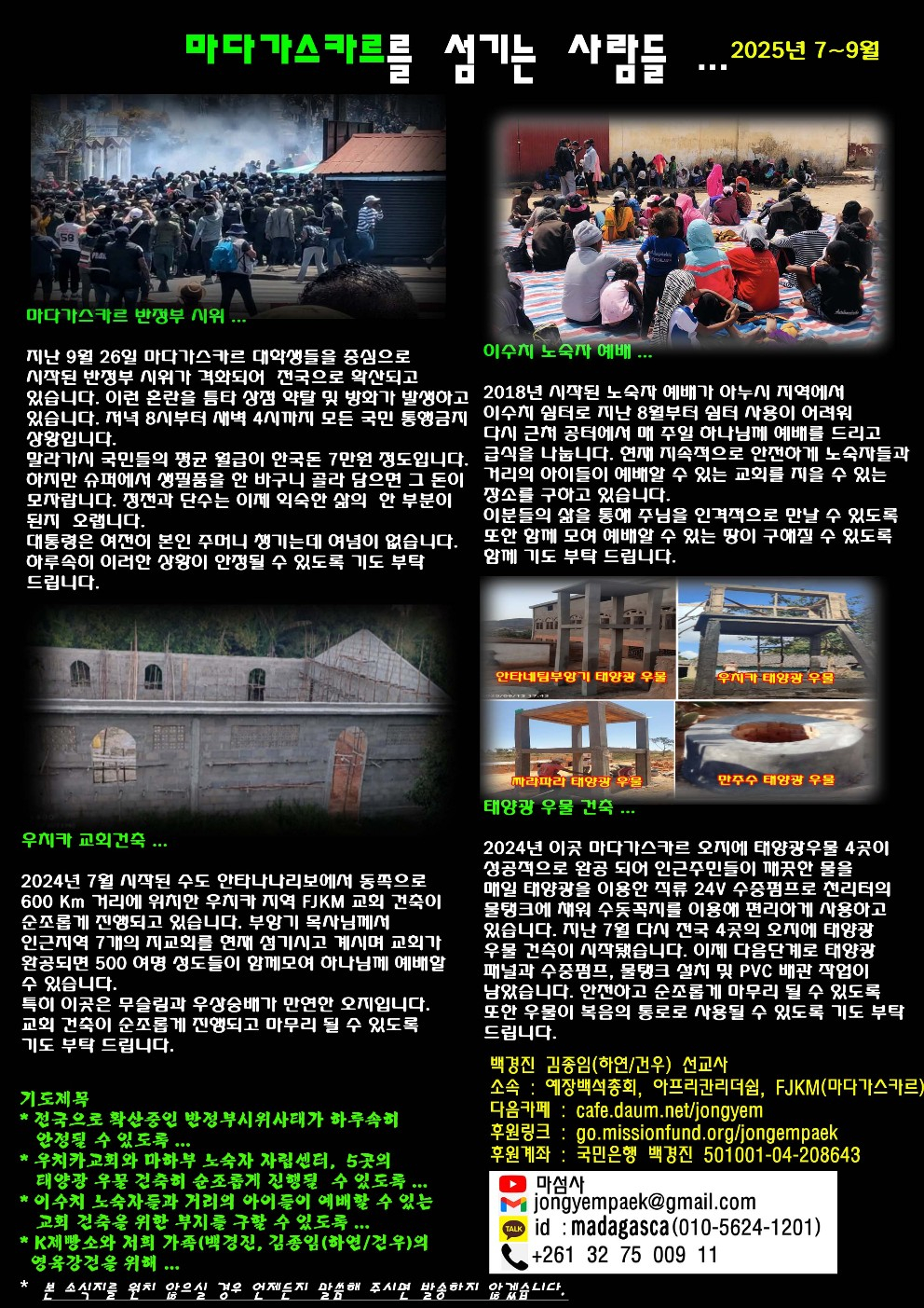 마다가스카르 백경진선교사님 기도편지입니다_2025년 10월