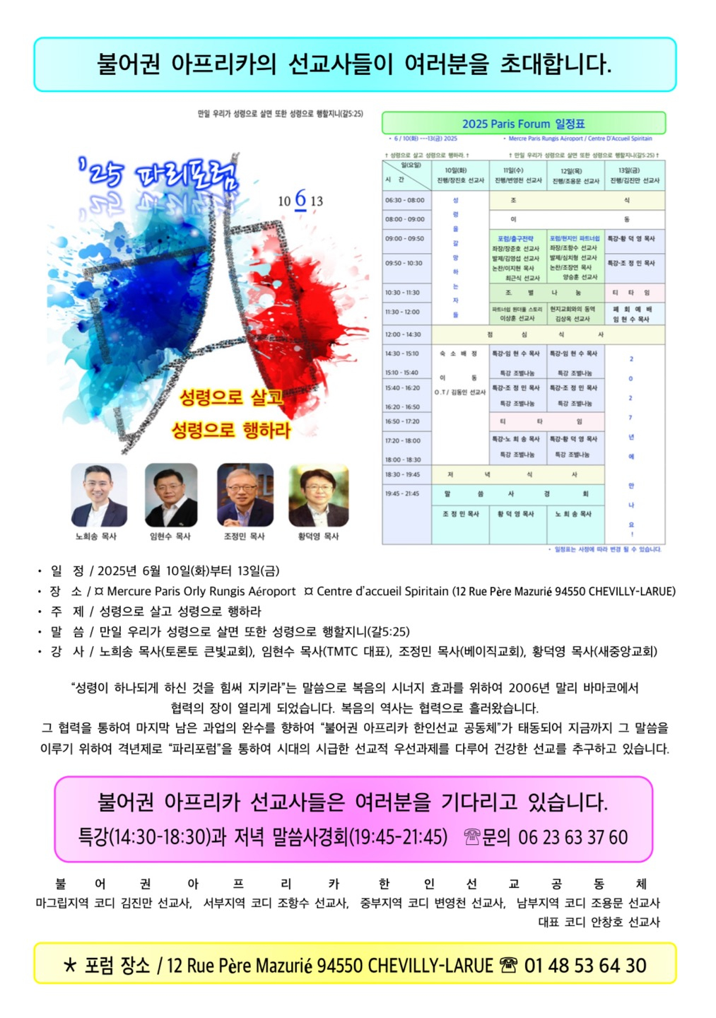불어권 아프리카 한인선교사들을 위한 집회 “ 파리포럼”이 6/10 - 6/13 일까지 파리에서 있습니다.