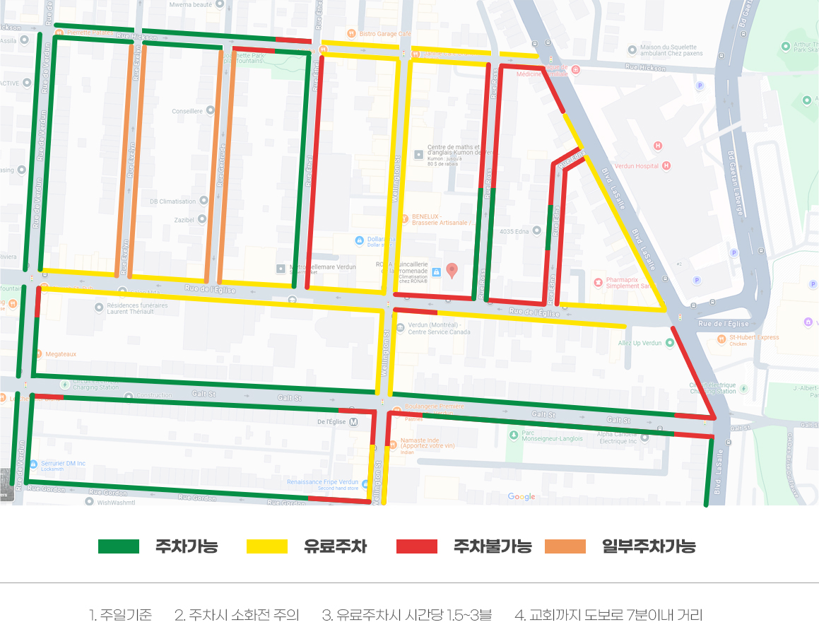 green line의 L'eglise(종점 : Angrignon) 역에서 내린뒤 중간 L'eglise 쪽으로 나오시면 맞은편에 교회 전경이 보입니다